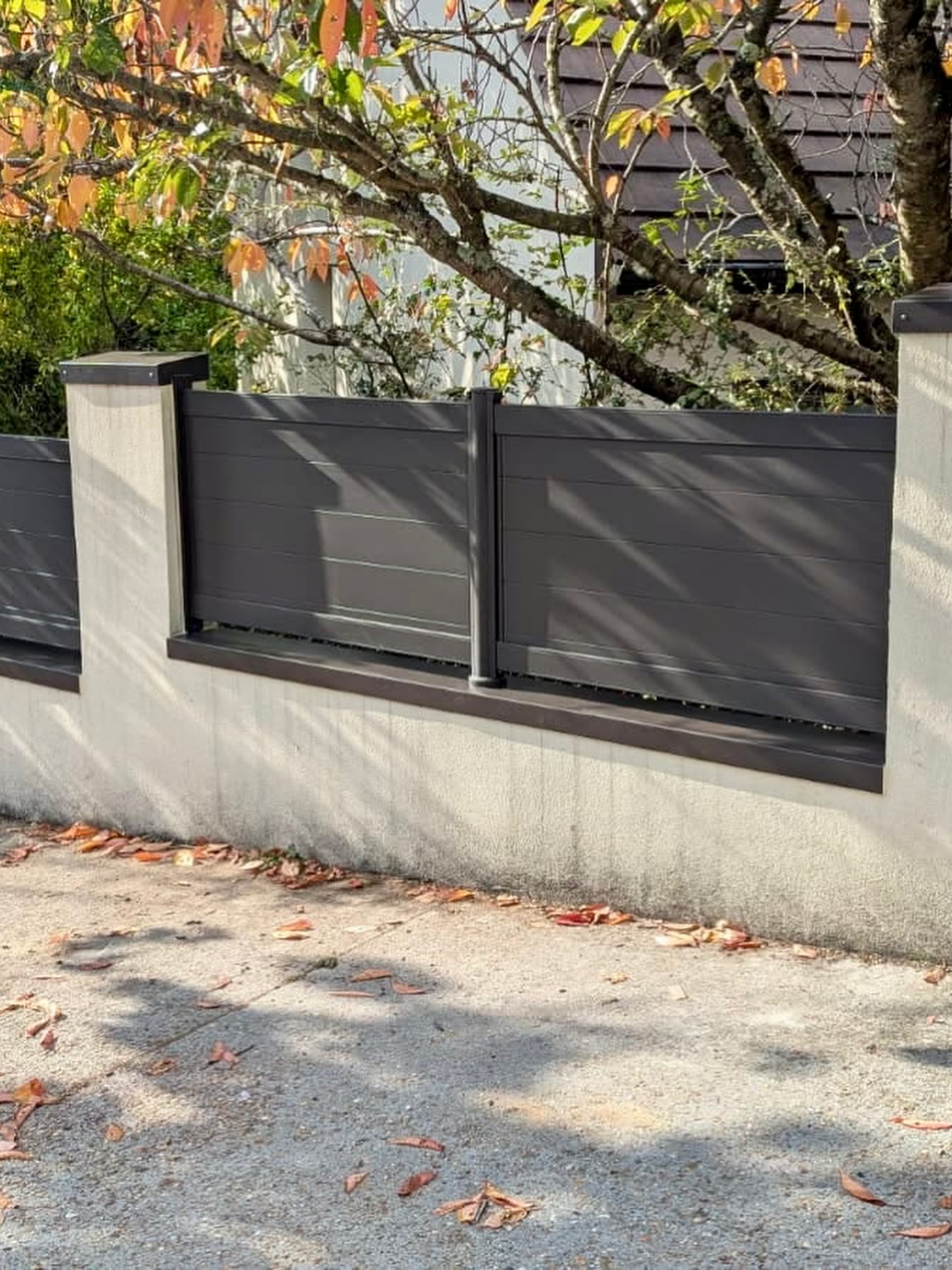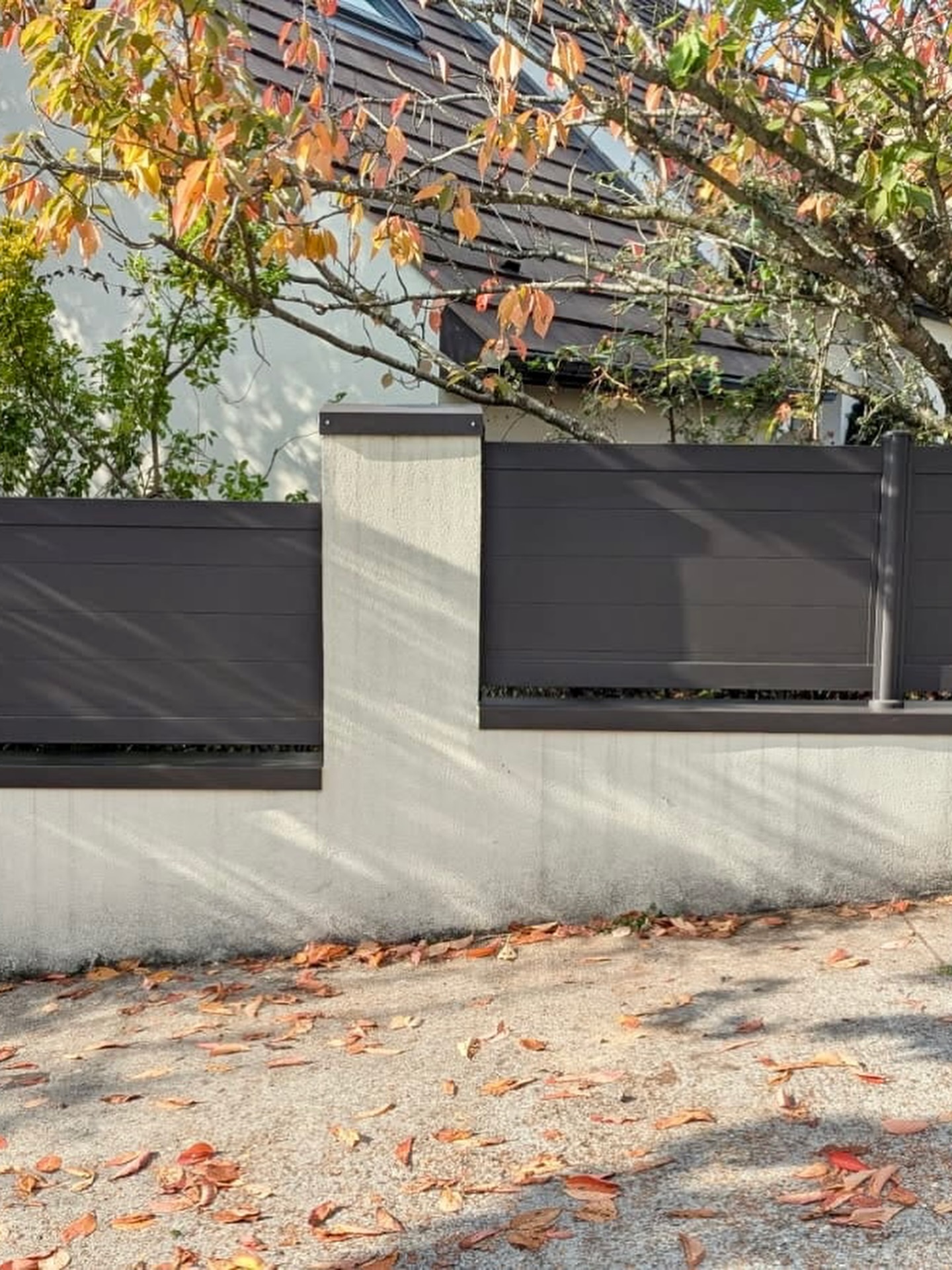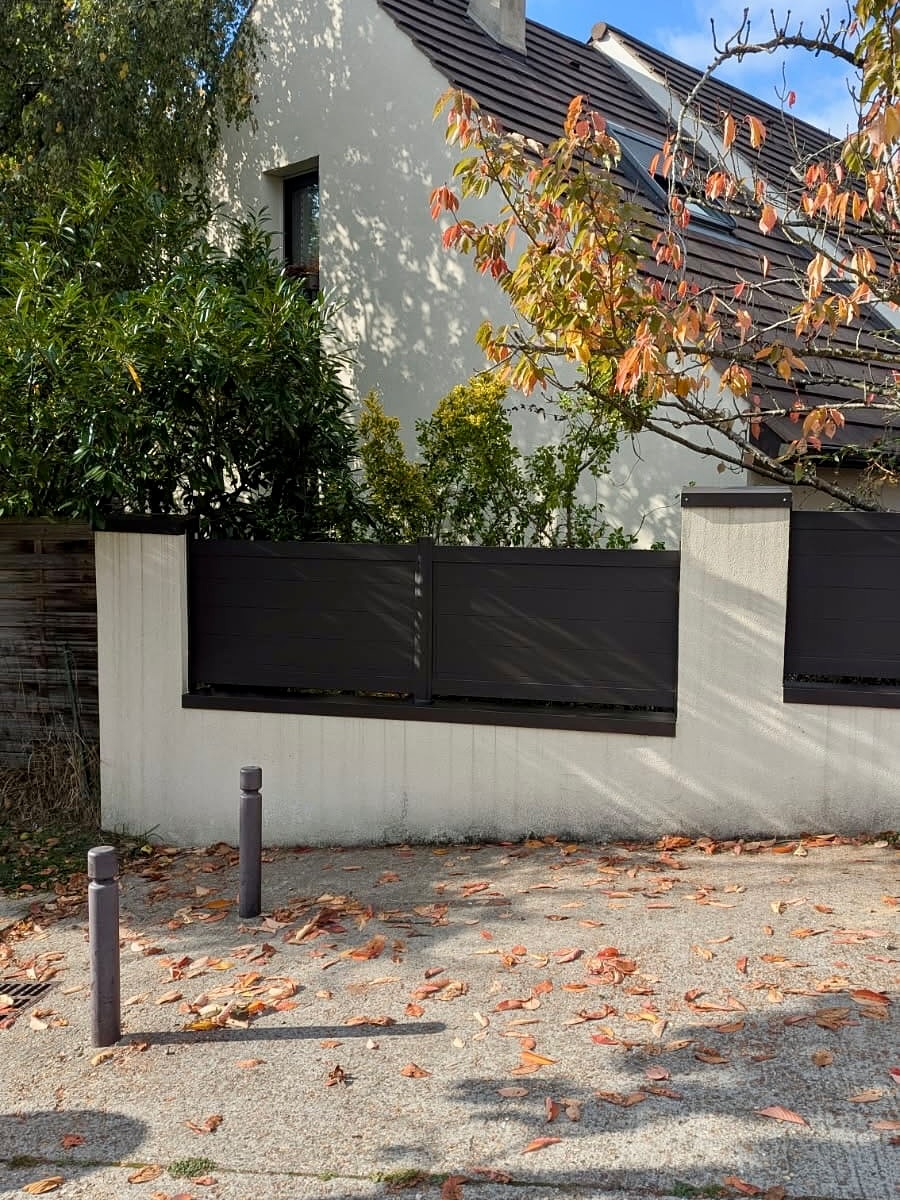 La personnalisation commence dès le choix de la teinte. Le RAL 8019, à la fois chaleureux et contemporain, s’intègre parfaitement dans les environnements urbains et périurbains du 95, notamment à Puiseux-Pontoise, Cergy ou Sarcelles. Mais ce qui rend cette réalisation truly unique, c’est le motif « bananier » découpé au laser dans les panneaux une touche graphique et naturelle qui apporte du caractère sans sacrifier l’intimité.
