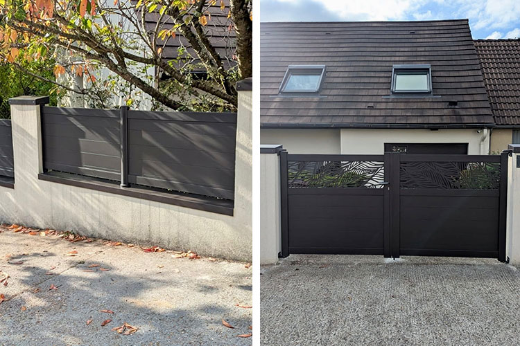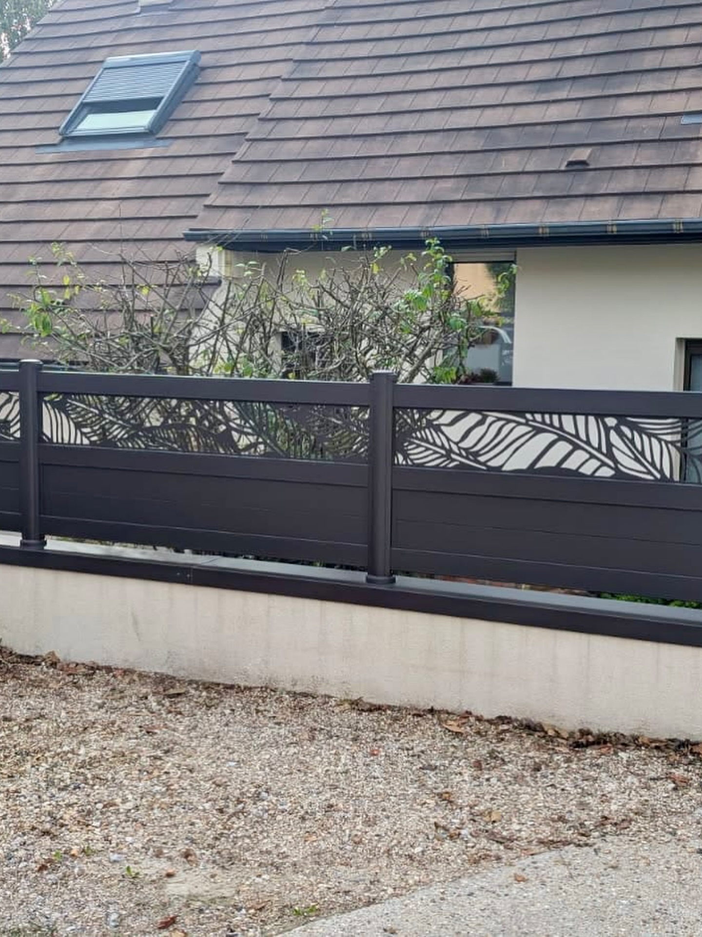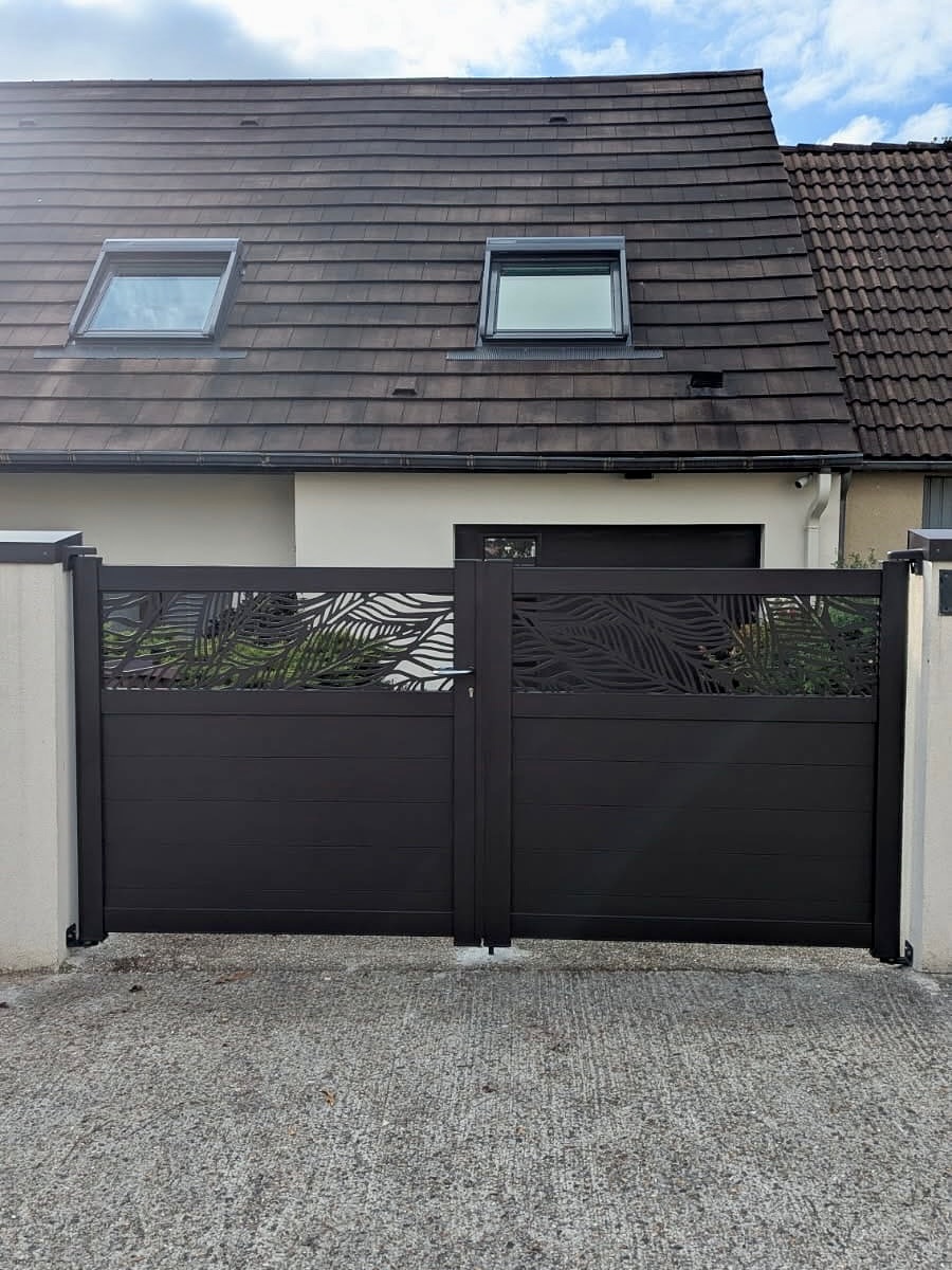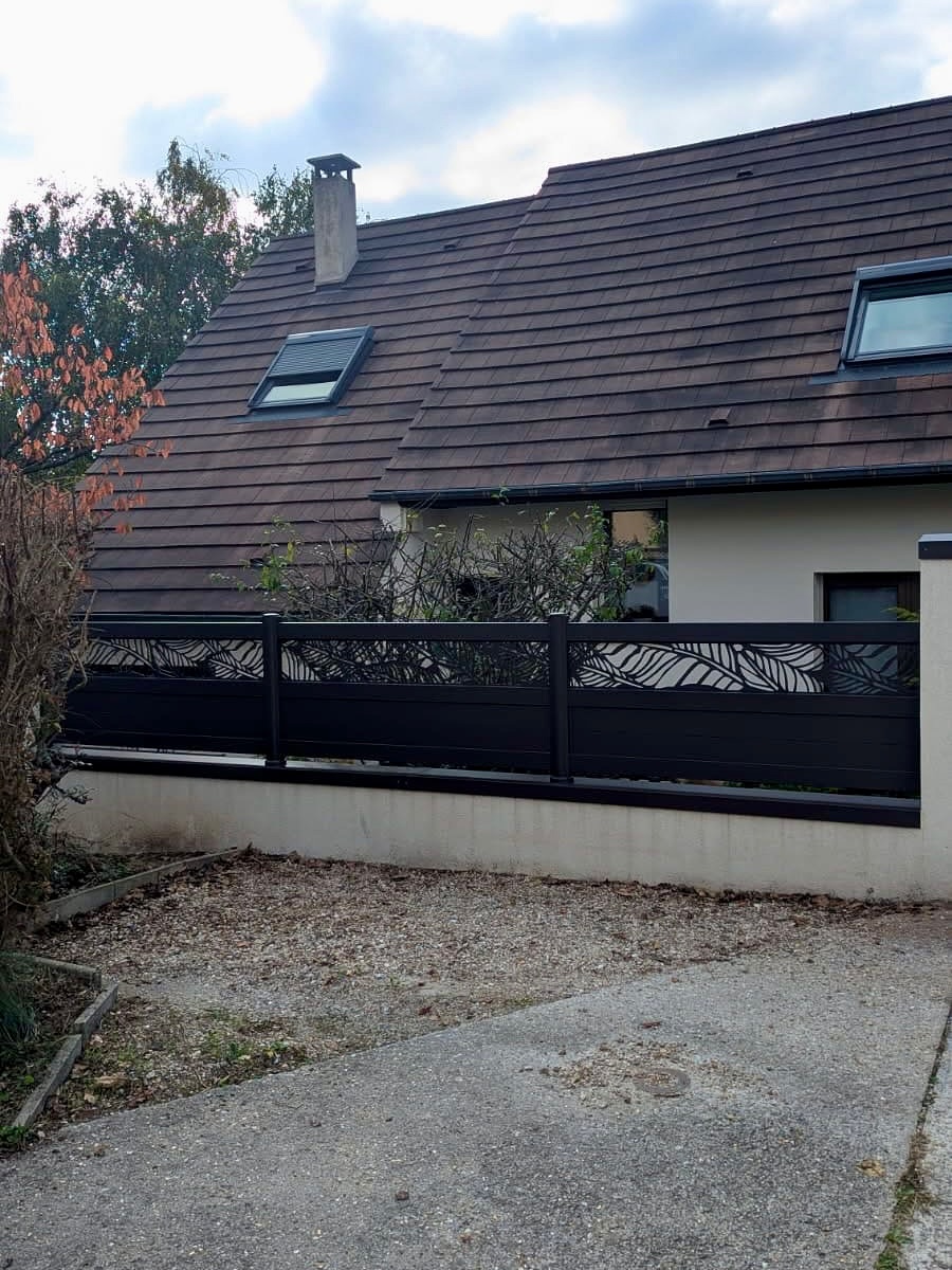 Découvrez une réalisation exceptionnelle signée Vexin Fermetures : un ensemble clôture et portail en aluminium laqué en teinte RAL 8019 (brun gris structuré), sublimé par une découpe laser sur mesure au motif « bananier ». Ce projet, conçu et posé dans le Val-d’Oise, illustre notre engagement à transformer chaque entrée en une signature architecturale unique.