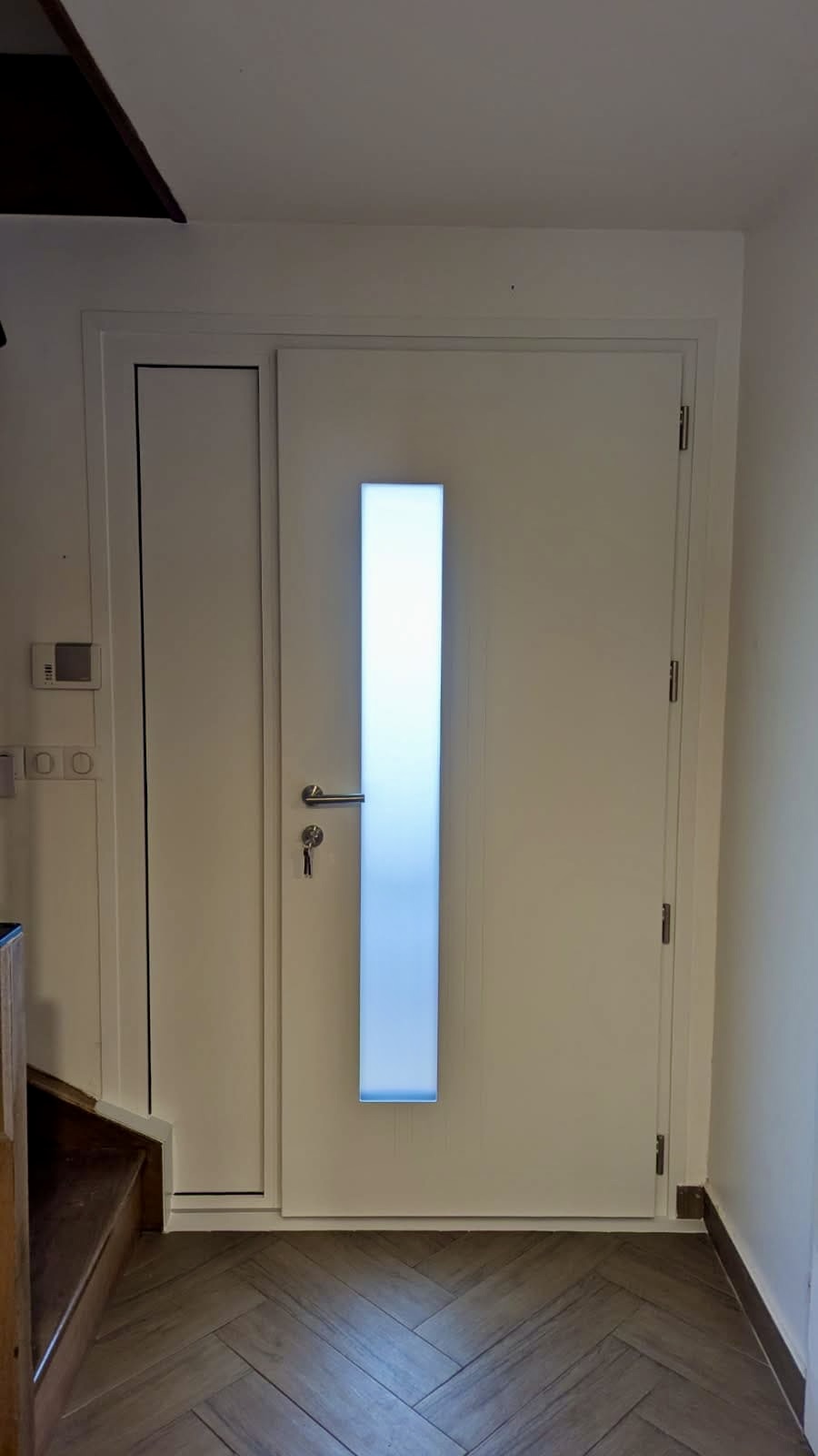 La porte choisie intègre un semi-fixe latéral avec remplissage panneau plat, une configuration idéale pour élargir visuellement l’entrée sans sacrifier l’intimité. Ce panneau opaque crée une symétrie élégante avec la partie active, tout en assurant une isolation optimale. Le résultat est une façade sobre, épurée et résolument contemporaine — parfaitement adaptée aux maisons modernes du Val-d’Oise.