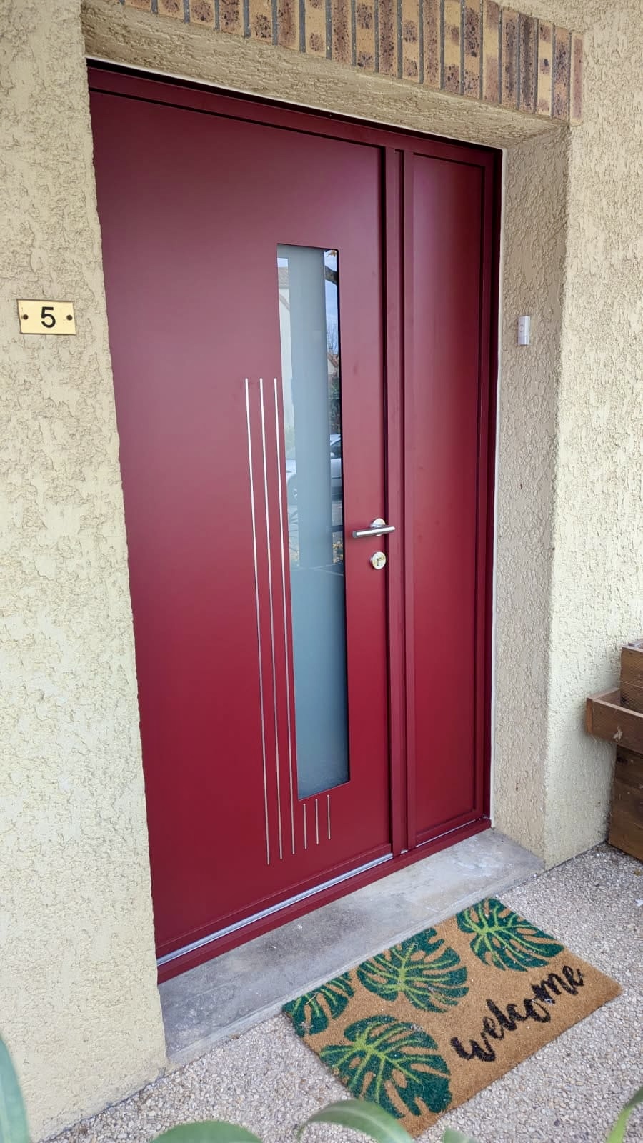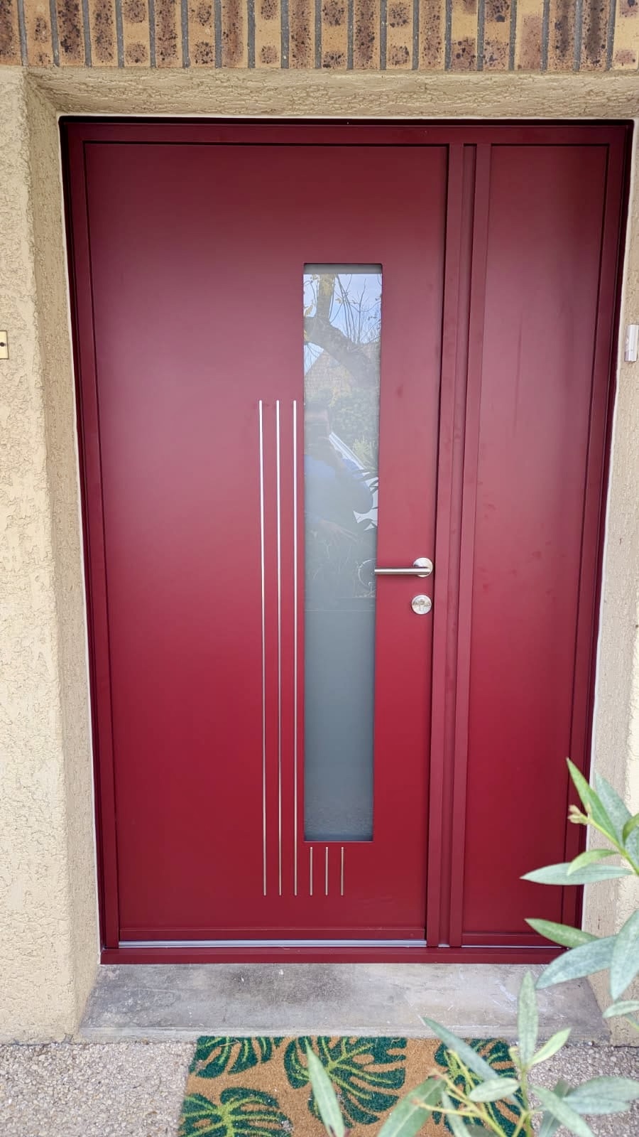 C’est la finition bicolore qui donne toute sa personnalité à cette installation : rouge RAL 3004 côté extérieur, une teinte profonde, chaleureuse et résistante aux UV, et blanc intérieur, pour une sensation d’espace, de clarté et de sobriété dans le hall d’entrée. Cette opposition subtile renforce l’identité architecturale de la maison tout en valorisant les volumes intérieurs.