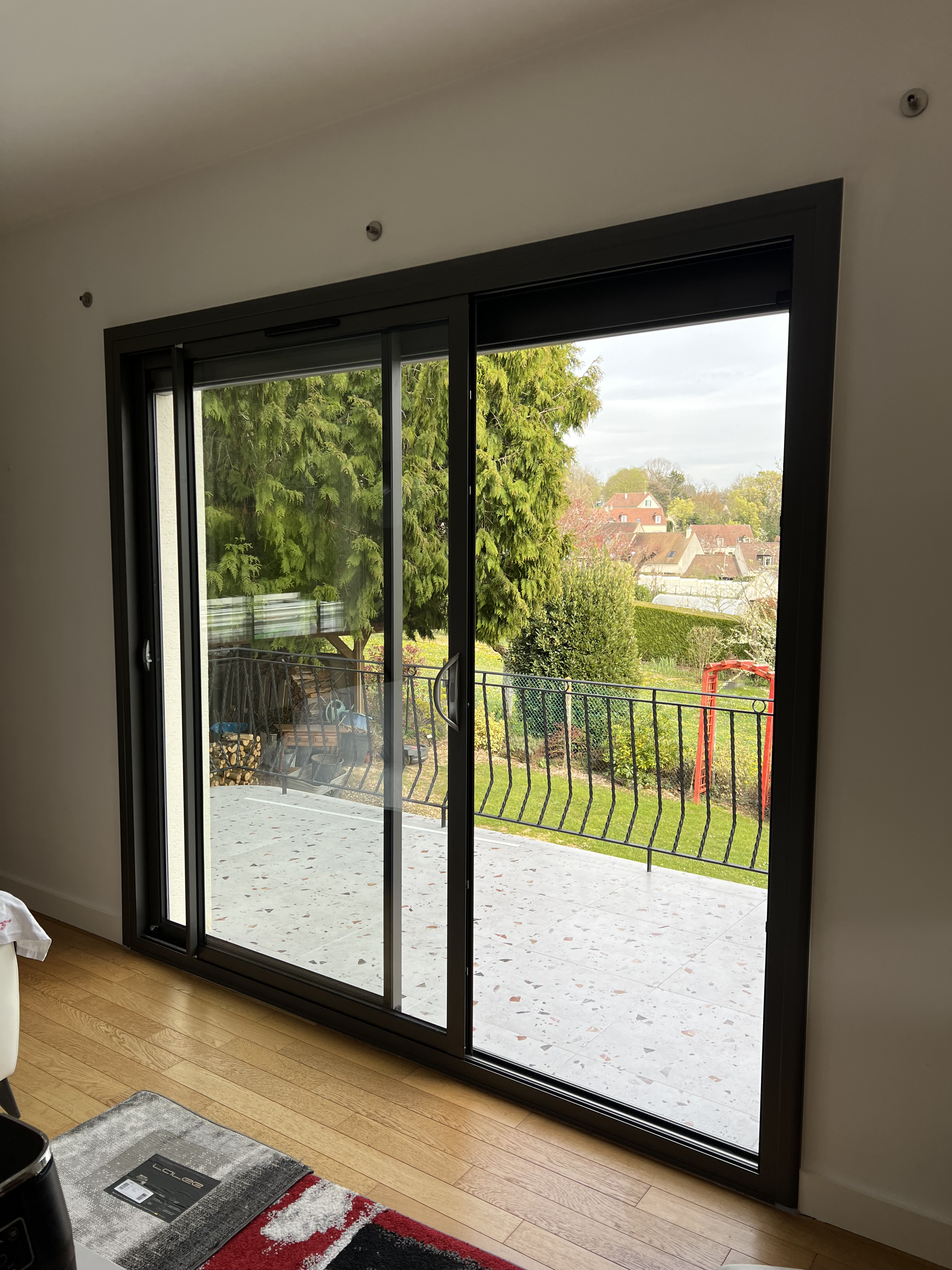 Nouvelle réalisation effectuée par nos équipes sur la commune de Vigny, avec la pose de menuiseries coulissantes en aluminium en finition gris 2900 sablé. Une teinte sobre et intemporelle qui s'intègre harmonieusement à l'habitation tout en apportant un maximum de luminosité grâce aux grandes surfaces vitrées.