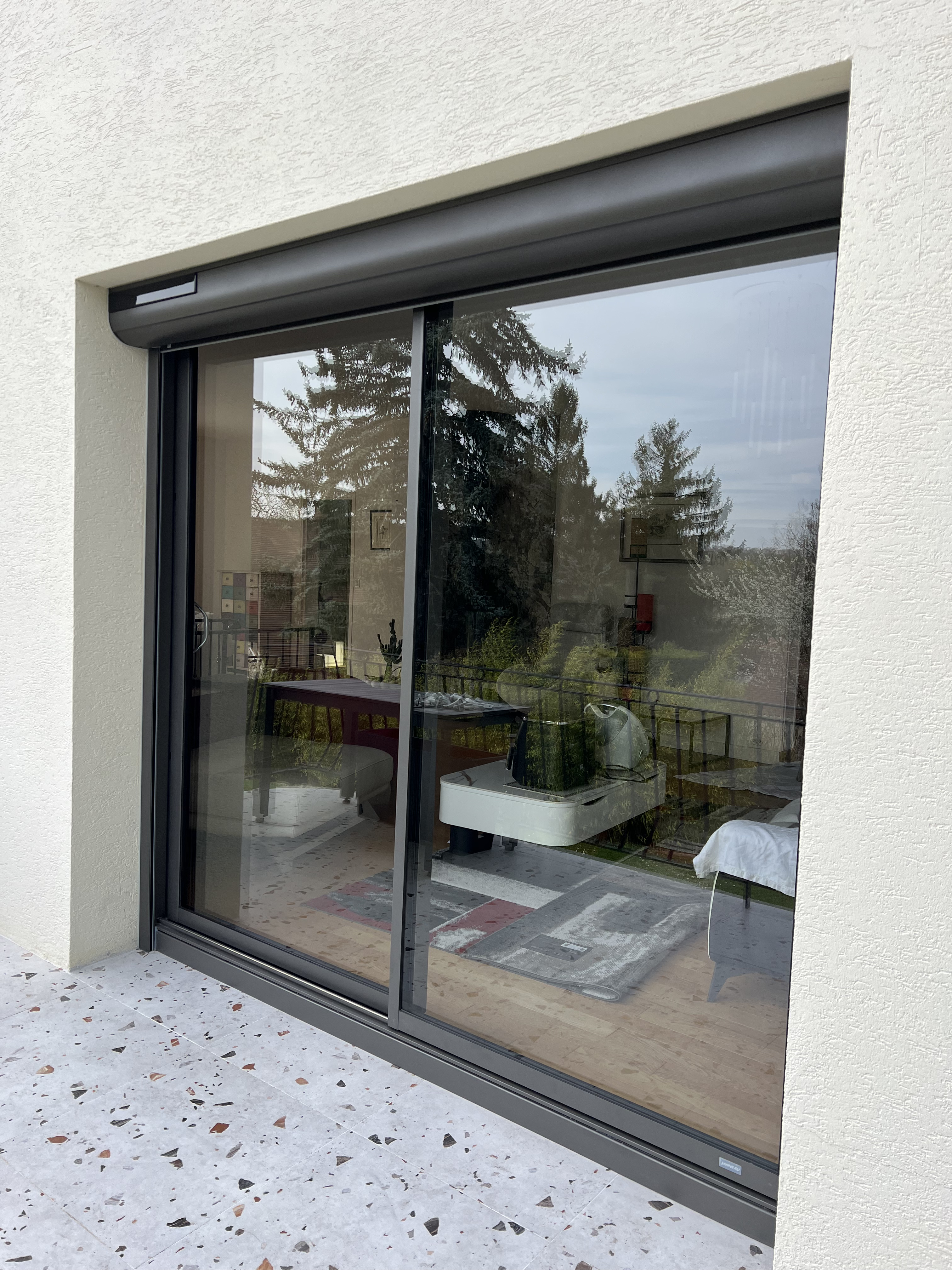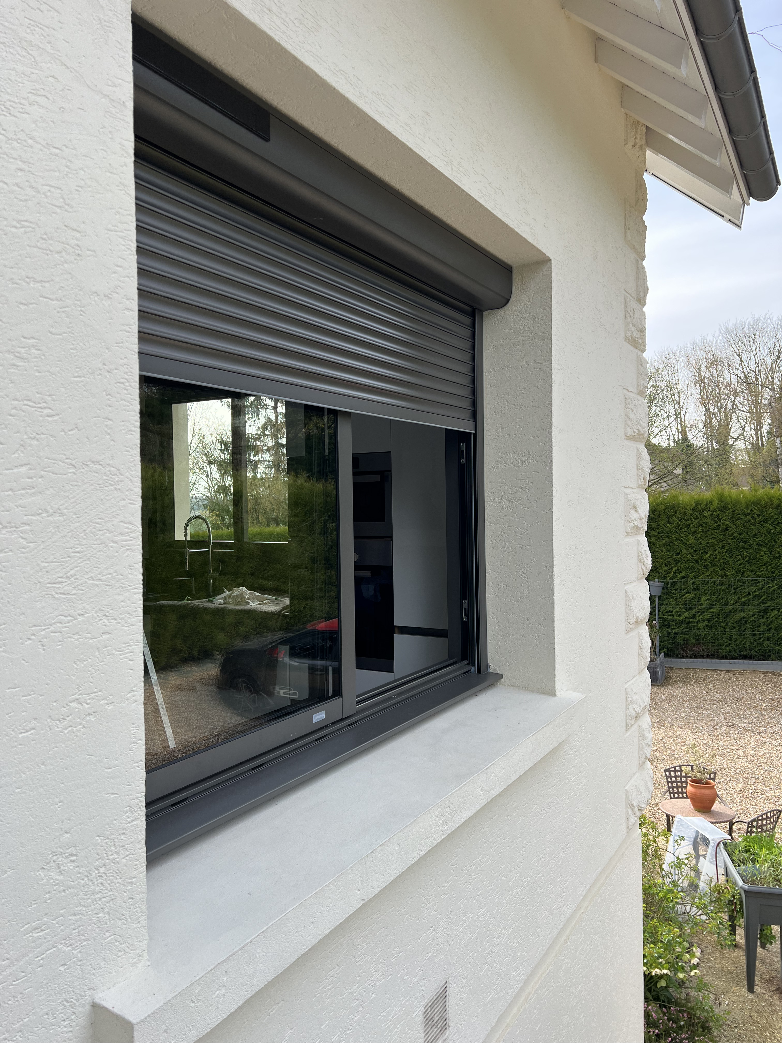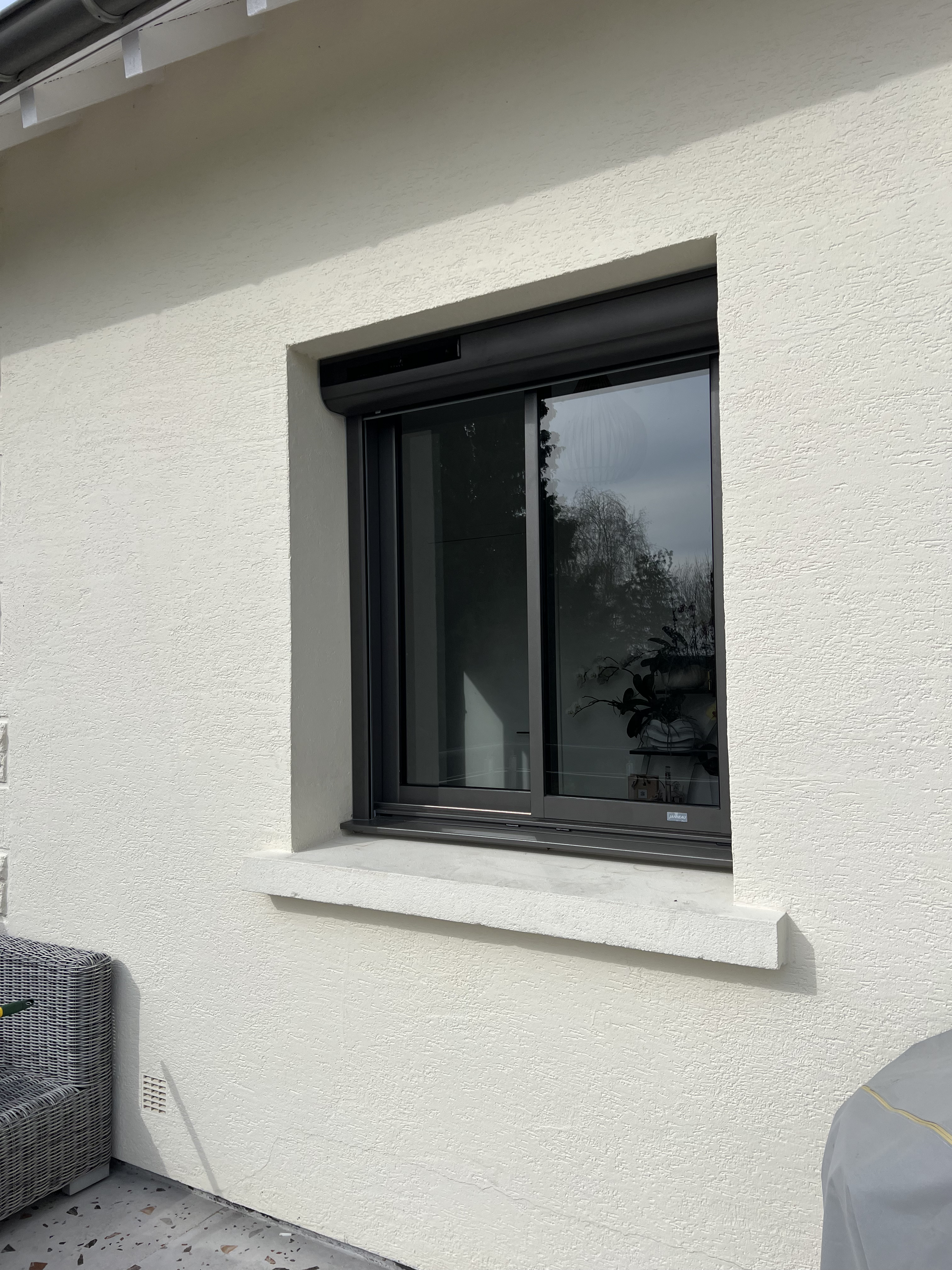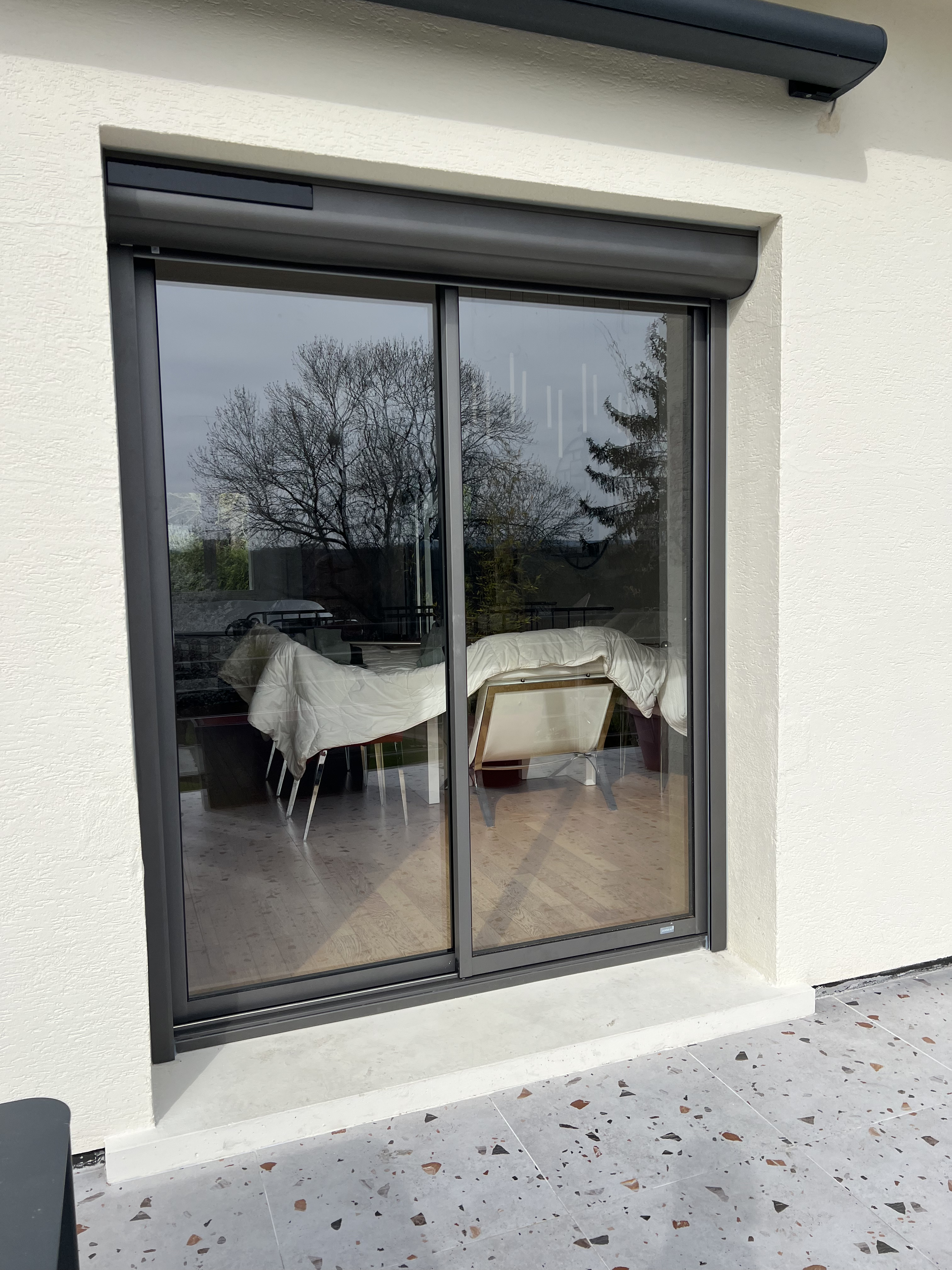 Le chantier s'est poursuivi avec la pose de volets roulants en aluminium à motorisation solaire, dans le même coloris gris 2900, parfaitement assortis aux menuiseries afin de créer une finition homogène sur l'ensemble de la façade.